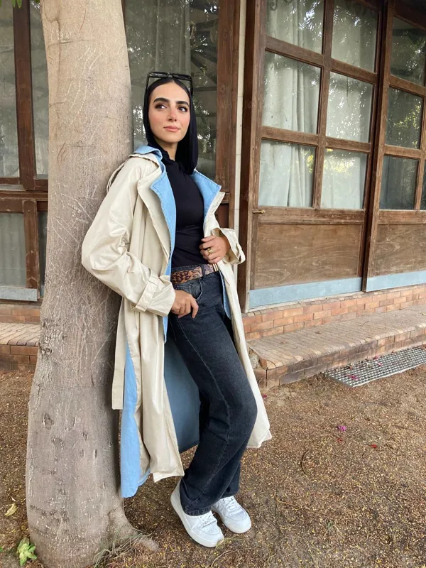 يتميز بتصميمه الفريد الذي يضفي لمسة من الجينز على طول فتحة المعطف